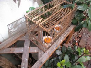 バードフィーダー6号の中にはミカンとシロップです。(ミカンは紙コップの中にビオトープで使っていた底床材を入れて嵩上げし、自家製庭木スティックで固定しています)