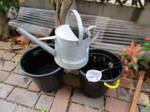 毎週休日にポリタンク1杯分のビオトープの水を取り換えます(スイレン鉢と黒バケツ2杯は他の用途で使用中のため取り換える水量が少なくなりました)