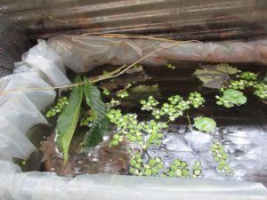 ビオトープに剪定したビワの葉っぱを入れました(冬場の隠れ家として水底には葉っぱがだいぶ溜まってきました)
