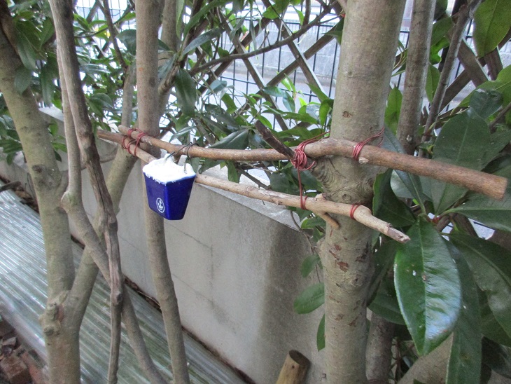 庭のバードフィーダー(20200112)10号作成編 砂糖水用にバードフィーダー10号を作成しました。 伐採した庭木のY字部分を2本使用し、その間に陶器を挟み込んで、 庭木に括り付けて完成です。 中身は砂糖水です。 一品増えました。 砂糖水には黒糖も入っています。 スポンサーリンク