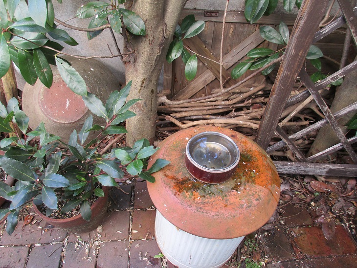 庭のバードフィーダー(20190210)9号マイナーチェンジ編 バードフィーダー9号に入れたミカンがよく落とされているので、石鹸置きとして売られていた小物を被せてみました。 こんな感じです。 スポンサーリンク